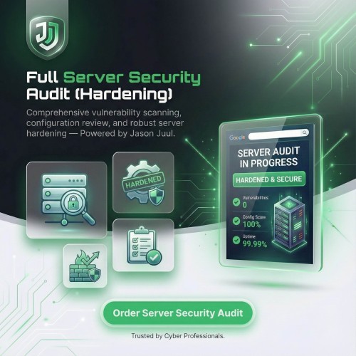 Tags: server audit, security audit, server hardening, vulnerability scan, penetration test, malware scan, ssh lockdown, firewall configuration, patch management, compliance audit, GDPR check, PCI compliance, Jason Juul, JasonJuul.com, cybersecurity, secure servers, intrusion prevention, data protection, system hardening, ethical hacker audit